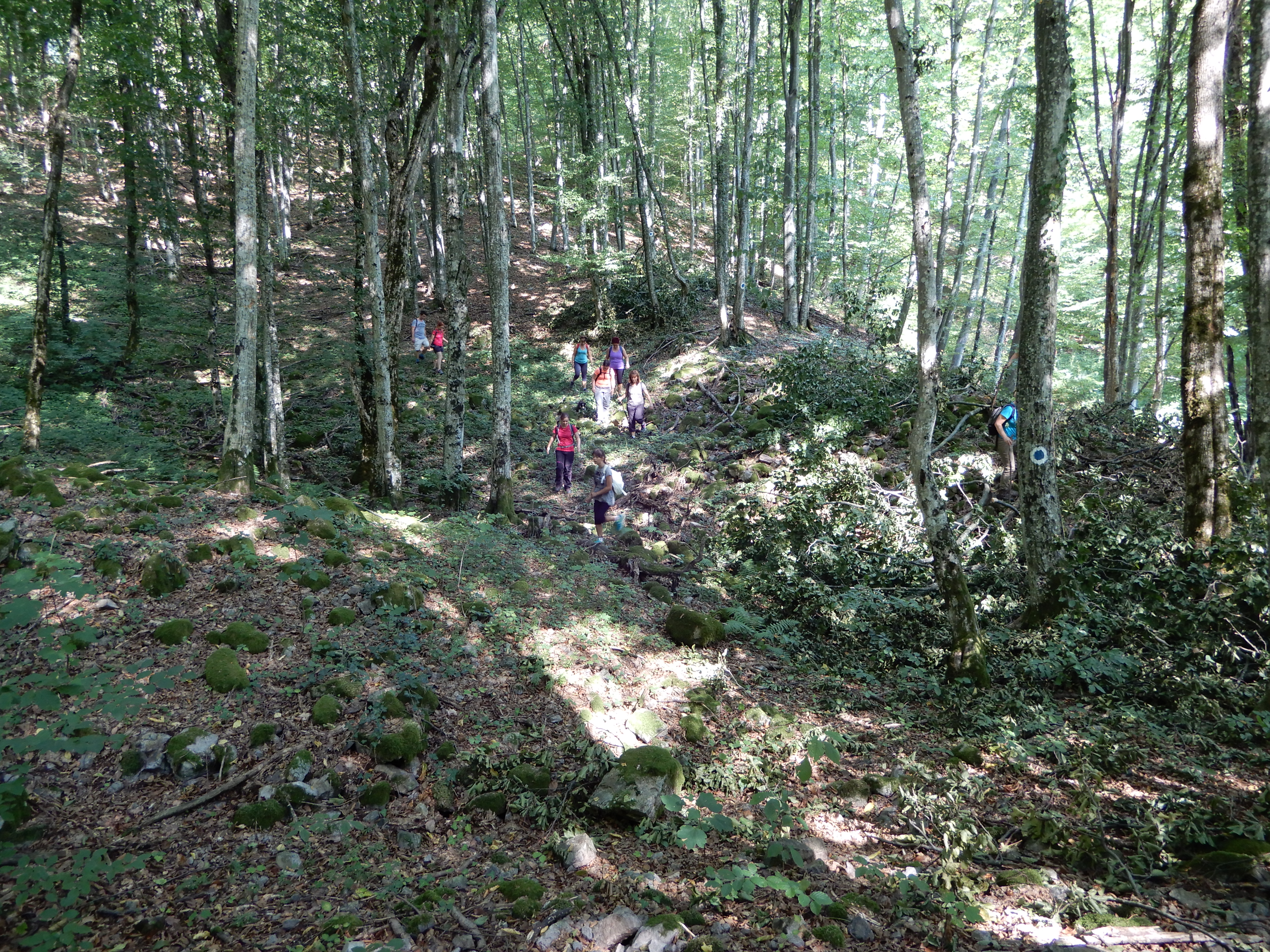 Mi sem tehettünk másképp, lassan és megfontolt léptekkel ereszkedtünk egy almafákkal és kis házikóval büszkélkedő lankás rétig. Itt vártuk össze a széthúzódó csapatot, majd visszatérve az erdőbe tovább ereszkedtünk a jelzett ösvényen egészen a patak medréig.