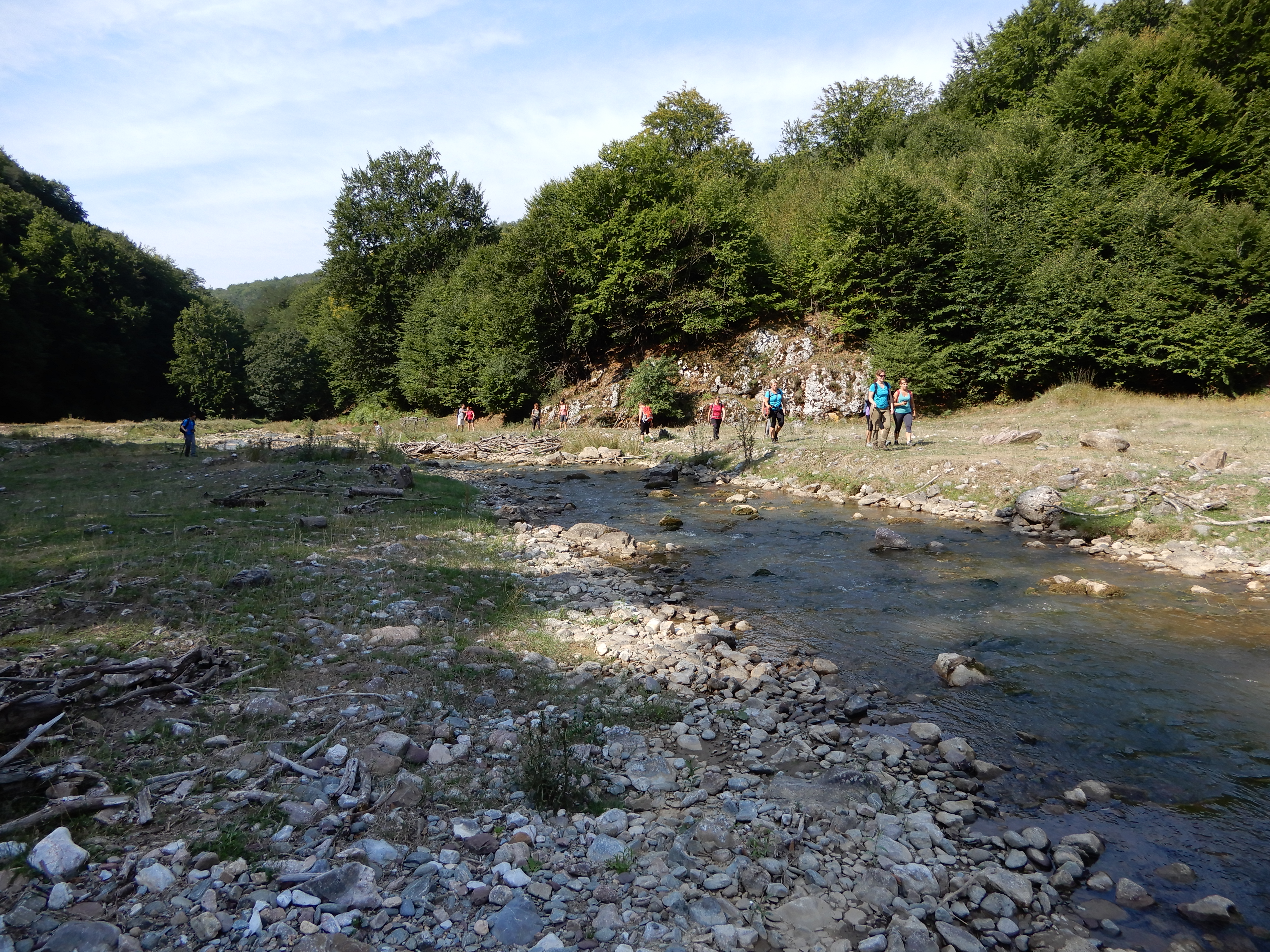 Itt egy kiszélesedő réten már a sziklaszoros aljában tudhattuk magunkat, és igazán szép látványban volt részünk a fölénk emelkedő mészkőfalak hatására. Innen első lépésként át kellett kelni a patak bal partjára. Nem volt nehéz feladat, hiszen a nyári szárazságban alacsony volt a vízállás. Innen folyásirányban folytattuk túránkat a jól láthatóan felfestett jelzés mentén, amíg az ösvény át nem váltott a patak jobb partjára. Mi is követtük, könnyen átkeltünk újra, bár itt már el kellett helyezni pár követ a megfelelő helyre.