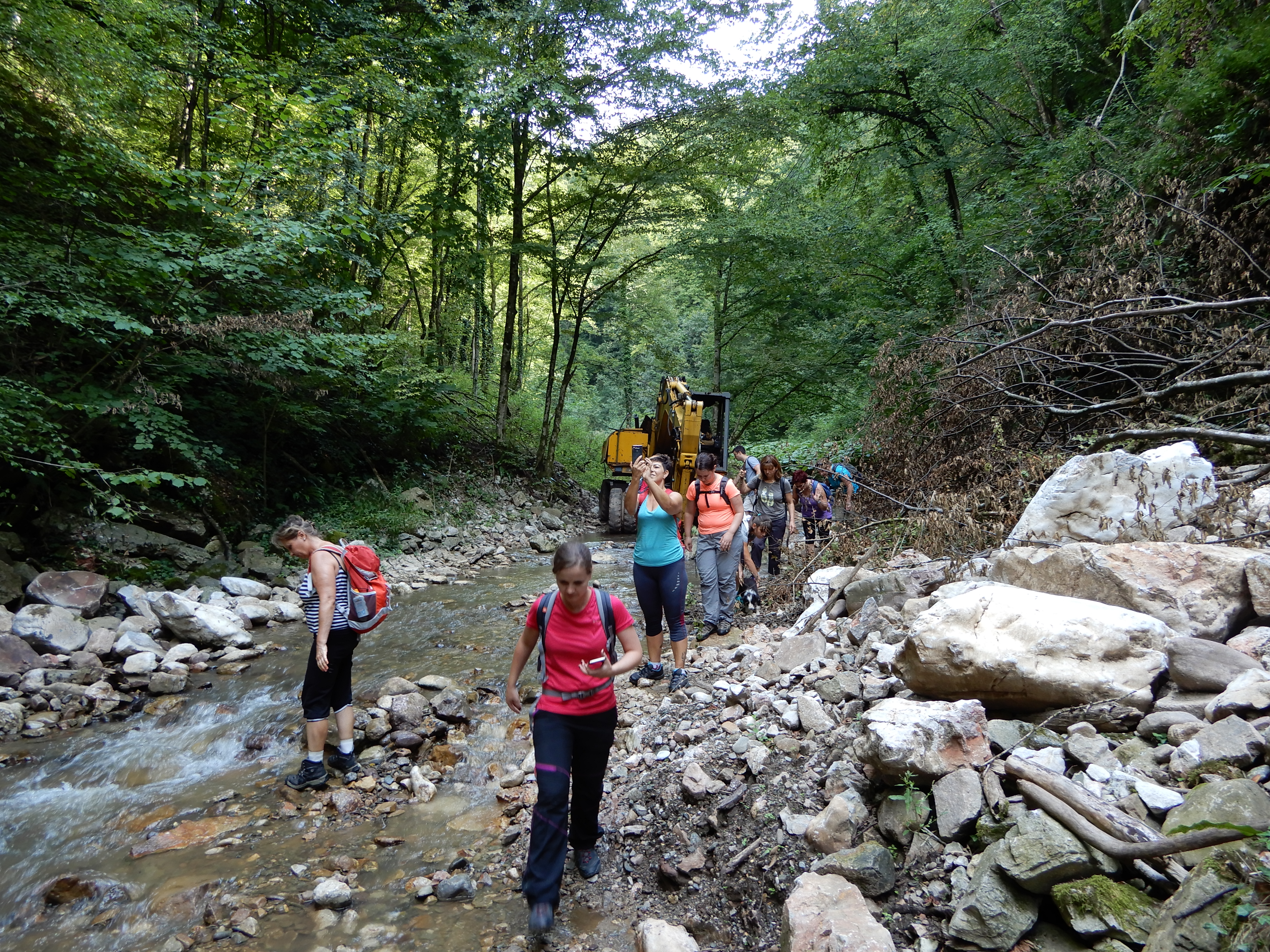 A munkálatoknak köszönhetően egy jól járható ösvény keletkezett a szorosban, a további patakátkelések már szükségtelenné váltak. Alig haladtunk néhány száz métert, amikor ismét egy kotrógép tűnt fel a mederben gazdátlanul, majd egy réten újabbak.