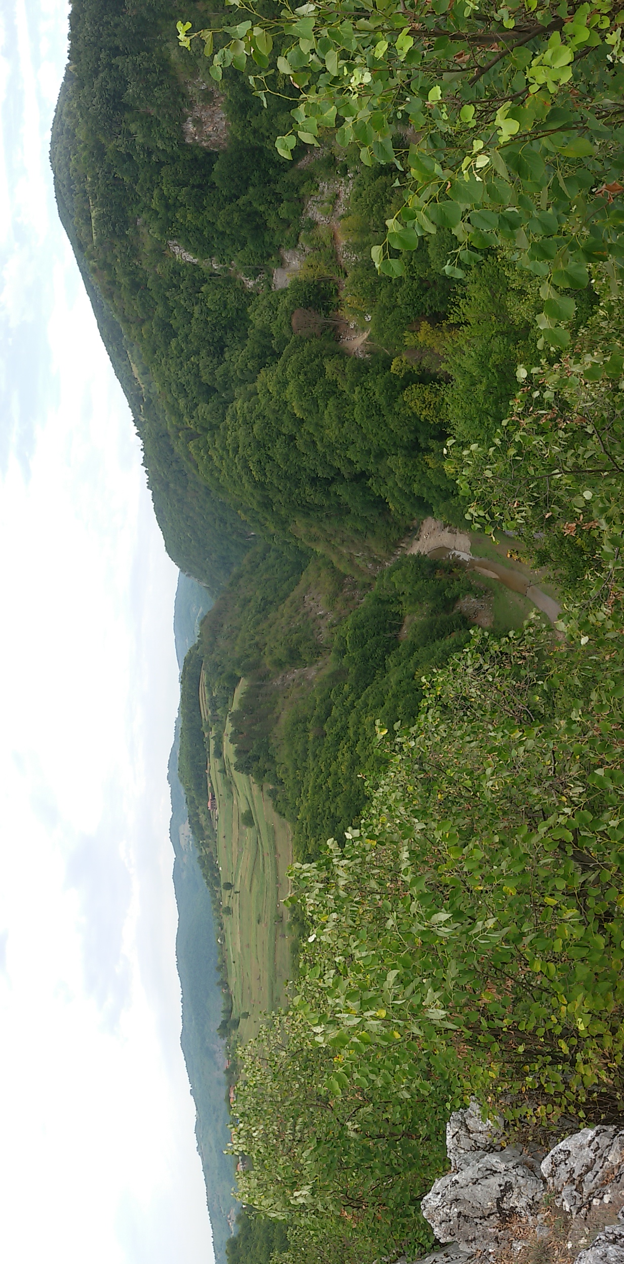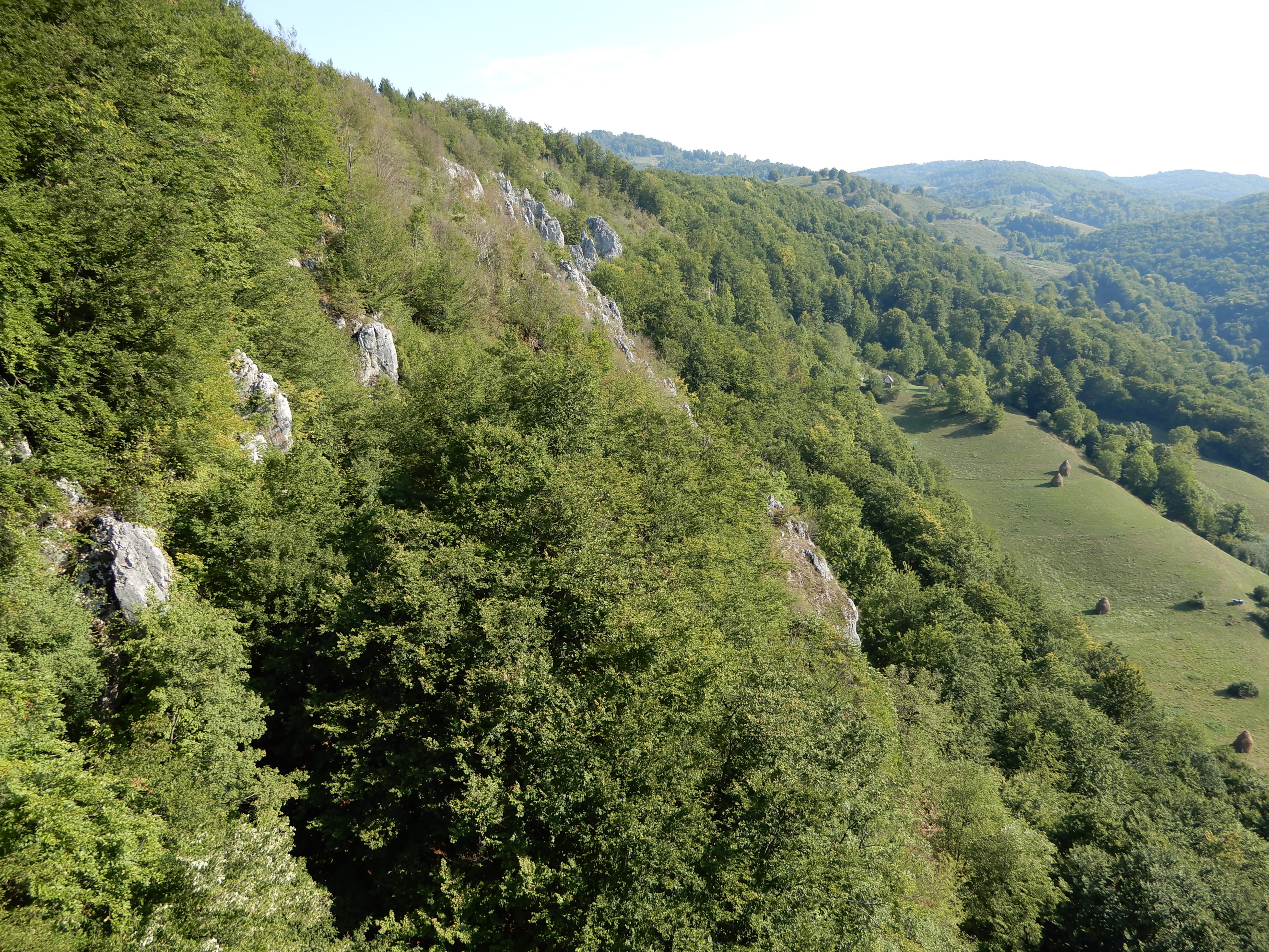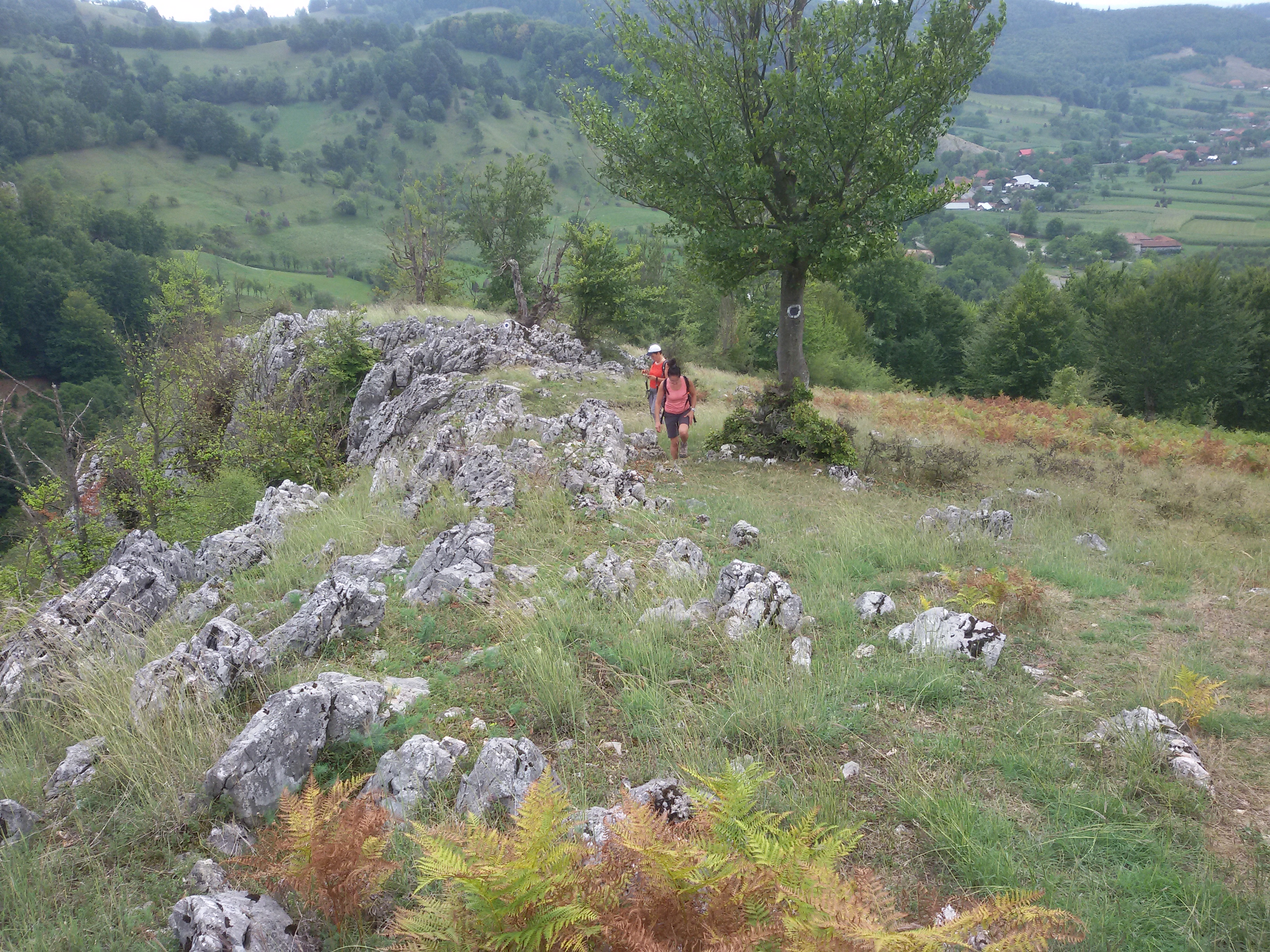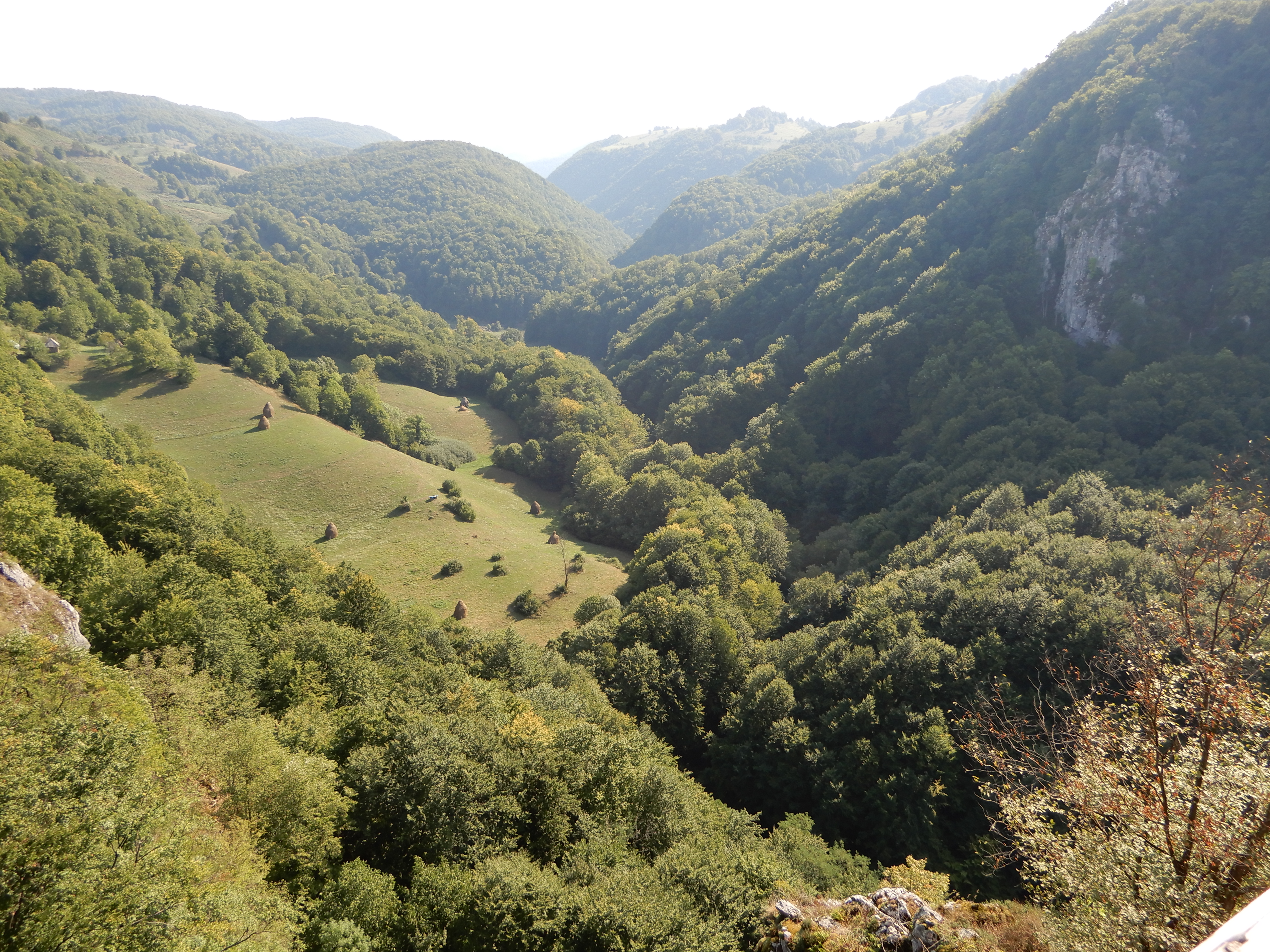 A rövid körtúra csúcspontja egy fából épített kilátóhely, ahonnan rálátni a Lazuri-völgy mészkő szirtekkel díszített felső szakaszára. A kilátó után nem sokkal a kék kör jelzés szokatlanul kettéválik, és a leváló ág erdős részen azonnal ereszkedni kezd a patakmeder jobb partja fölé magasodó sziklafal mentén. Mi is ezt az ágat választottuk. Rendkívül keskeny, sziklás ösvényen haladtunk, egyik oldalunkon sziklafal, a másikon szakadékszerű meredek lejtő. Ilyen helyeken máshol láncos kapaszkodóval teszik biztonságossá a haladást, de itt csak az óvatosság és elővigyázatosság fokozása maradt biztonsági stratégiaként.